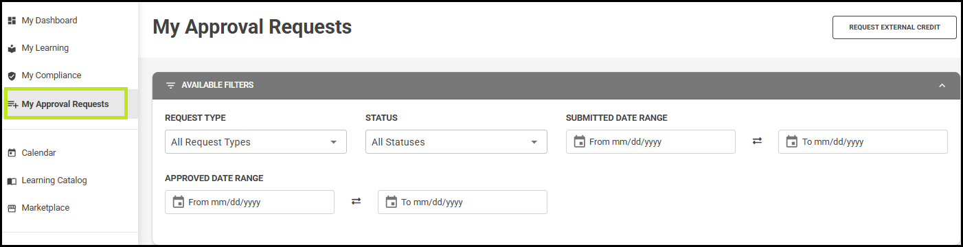 - Professionals will be able to request external credit by navigating to the My Approval Requests hub and selecting Request External Credit.