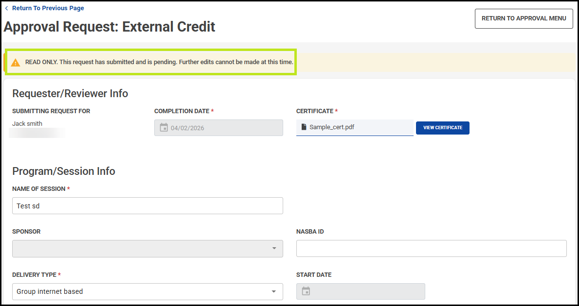 - If denied by an admin: This external credit submission will remain in the user’s Approval Request menu indefinitely. Credit is read only to the professional and administrative team.
