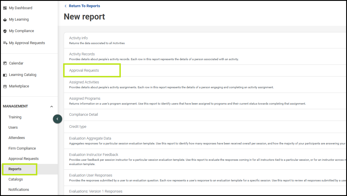 A report template labeled Approval Requests is available for administrative reporting needs. This report can be found within the Reports hub titled Approval Requests.