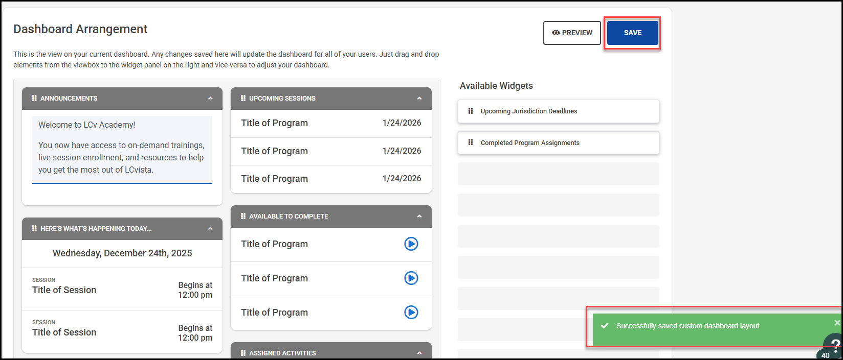 Administrators have the ability to customize the layout of the Dashboard as it appears to professionals on LCvista.