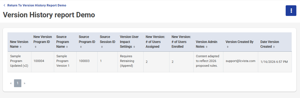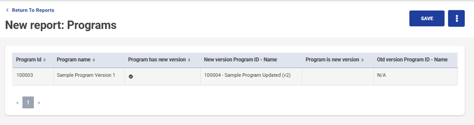 Program and session-related reports include columns to identify the source program in question as either a new version of a learning experience or a new version.