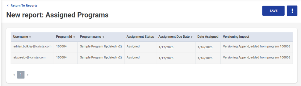 The Assigned Programs report shows programs assigned to users, the due date, and other details. It now also indicates if the assignment resulted from a new version being automatically assigned to the user.
