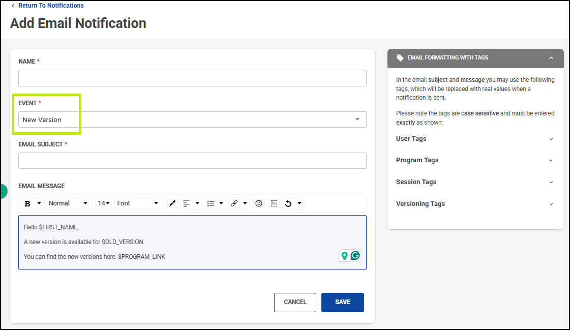 An administrator must trigger this template manually when creating the new version. It includes dynamic email tags for user, program, session, and version details to tailor the message for affected individuals.