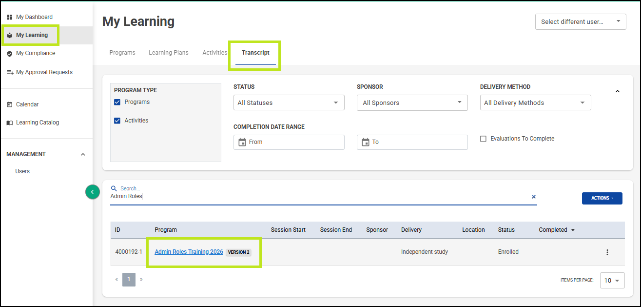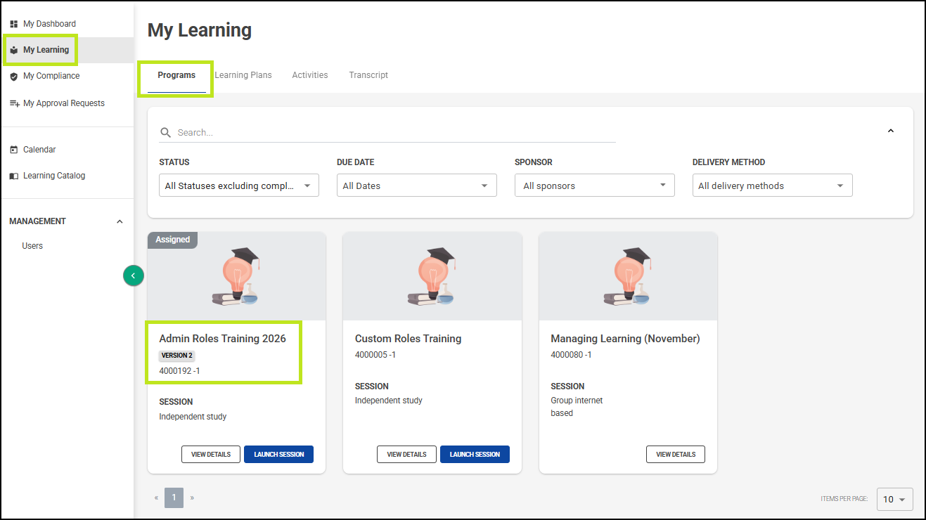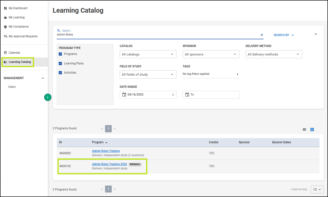 - Learning plans update automatically to include new versions. For example, if your original Tax Update 2025 program links to several learning plans and Tax Update 2026 replaces it, creating the new version updates all linked plans to show the replacement.
