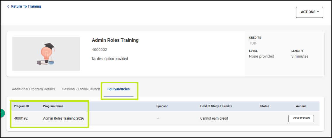 - Retroactive: Defines whether an equivalency applies to completions before the equivalency was set. When False, equivalency only applies to completions at the effective date of the equivalency and beyond.