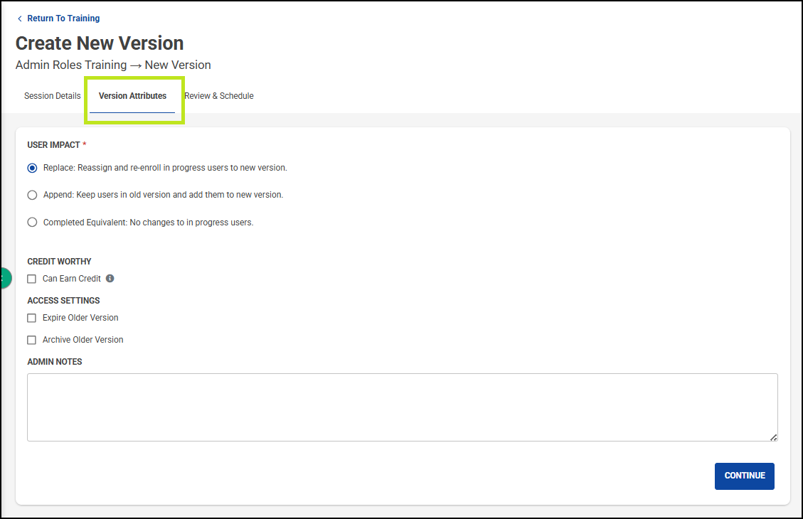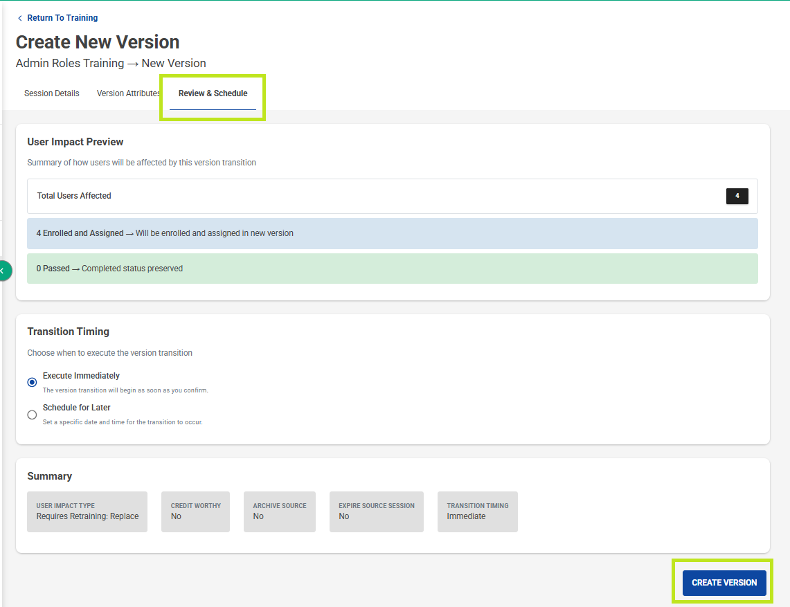 - Replace with new version, requires retraining, moves all in-progress users to the new version. Users are assigned and enrolled in the new version and unassigned and unenrolled from the previous version (excluding passed session record statuses).