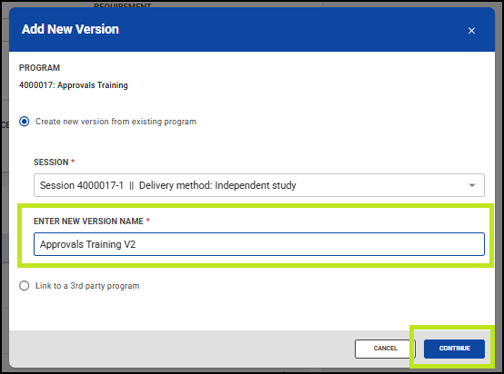 - Create a new version from an existing program: Specify the session to create the new version from.